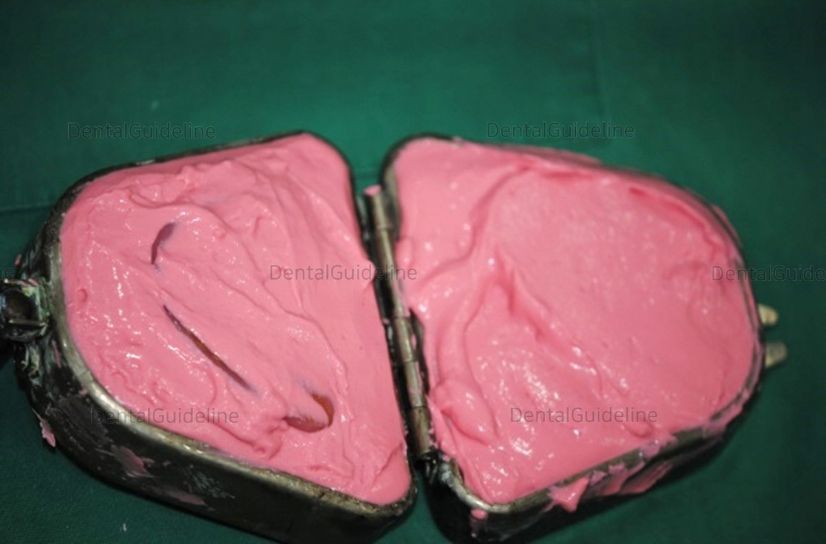 After flattening the alginate evenly, place the denture so that half of it is submerged.