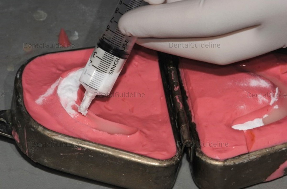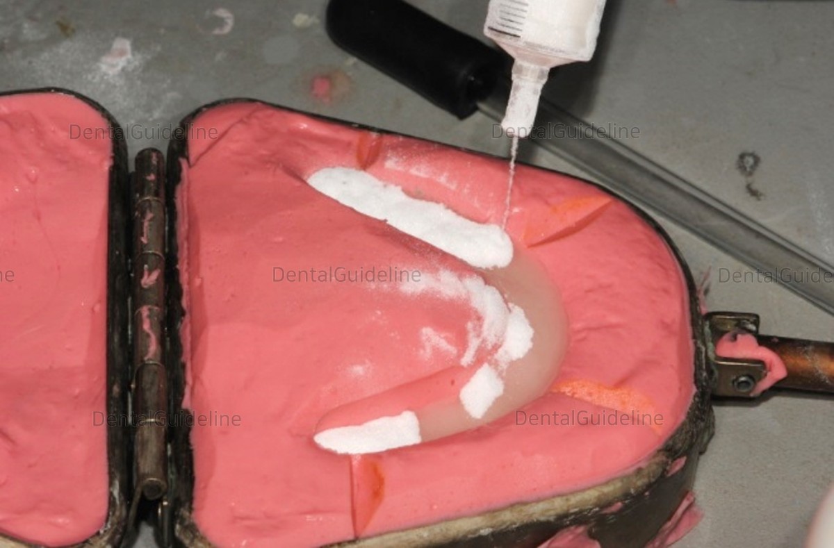 Sprinkle resin powder on the alginate impression surface. After that, sprinkle the resin liquid little by little Do this until the powder is sufficiently wetted with the liquid.