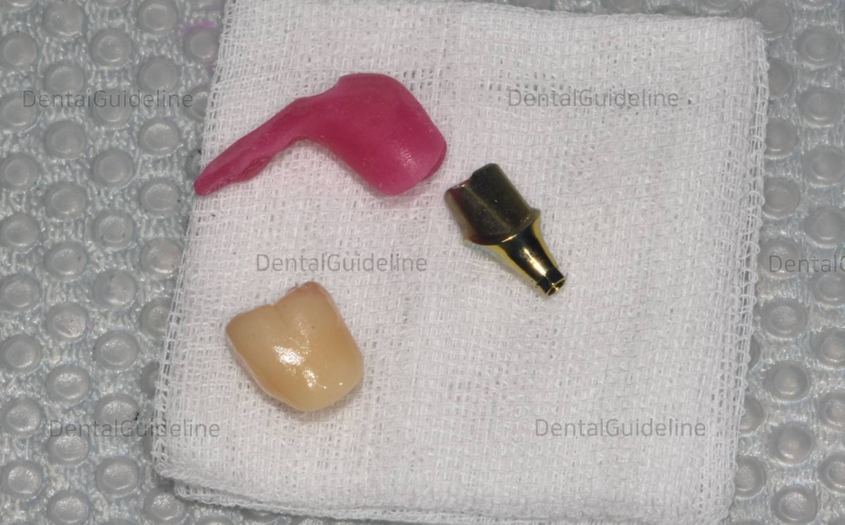The photo shows a customized abutment, orientation jig, and crown(zirconia)
